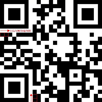 - 关键部分已用红色框框起来,识别方向也已用箭头标示。假定黑色块为1,白色为0,那么:两黑色块平列,黑+黑=11,容错级为L;黑+白=10,为M级容错;白+黑=01,为Q级容错;白+白=00,为H级容错。